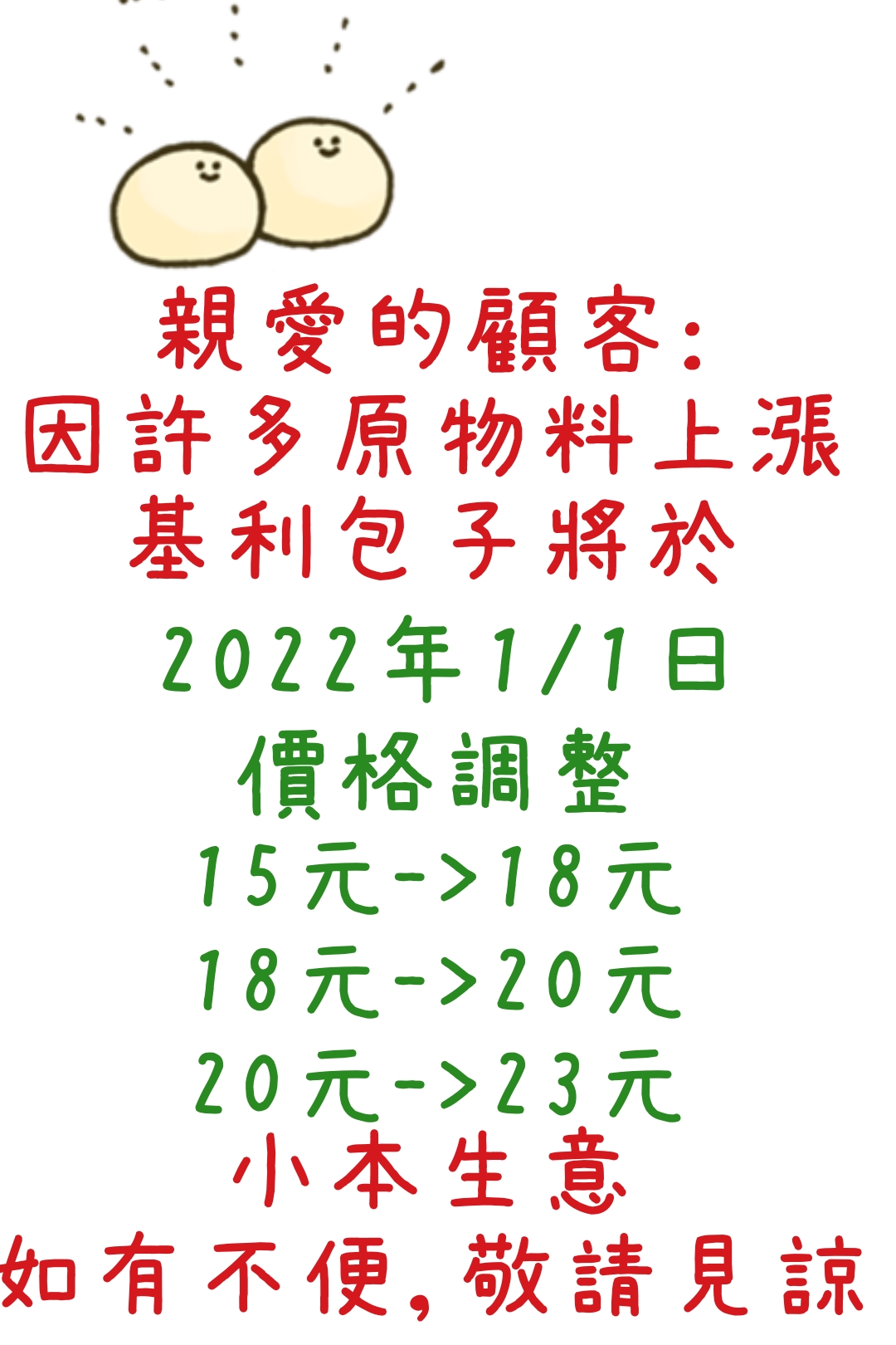 原物料持續上漲,為維持包子用料品質,不得已將在2022/1/1日價格調整: (
