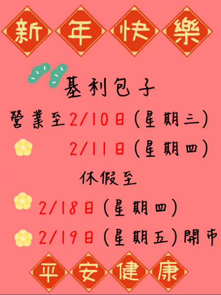 年假公告囉!因年前物流量大不確定延遲到貨,堅持到您手上的包子是新鮮的,所以2/1日停止宅配囉: )開市即可訂購!謝謝您